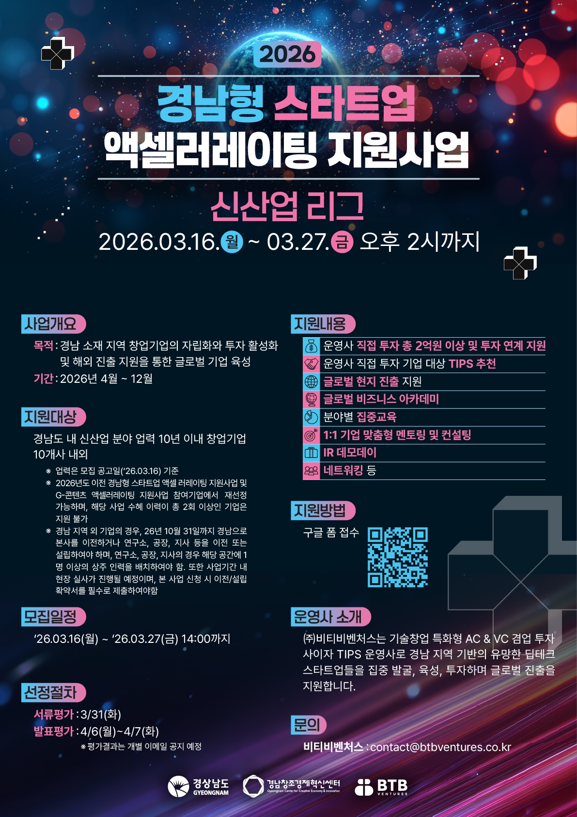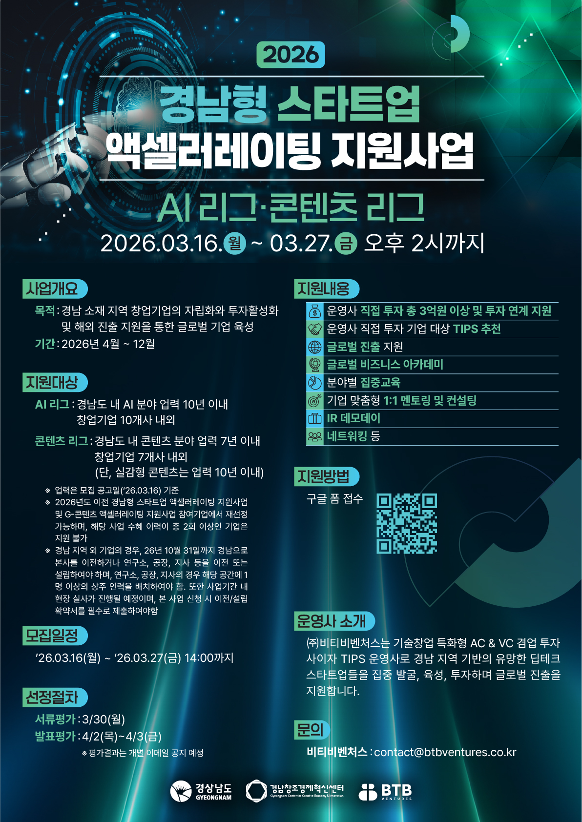 경남지역 소재 창업기업의 자립화와 투자 활성화, 글로벌 진출 및 성장을 지원하기 위해 「2026년 경남형 스타트업 액셀러레이팅 지원사업」 (AI 리그, 콘텐츠 리그, 신산업 리그) 참여기업을 모집하오니 많은 관심과 참여 바랍니다.
